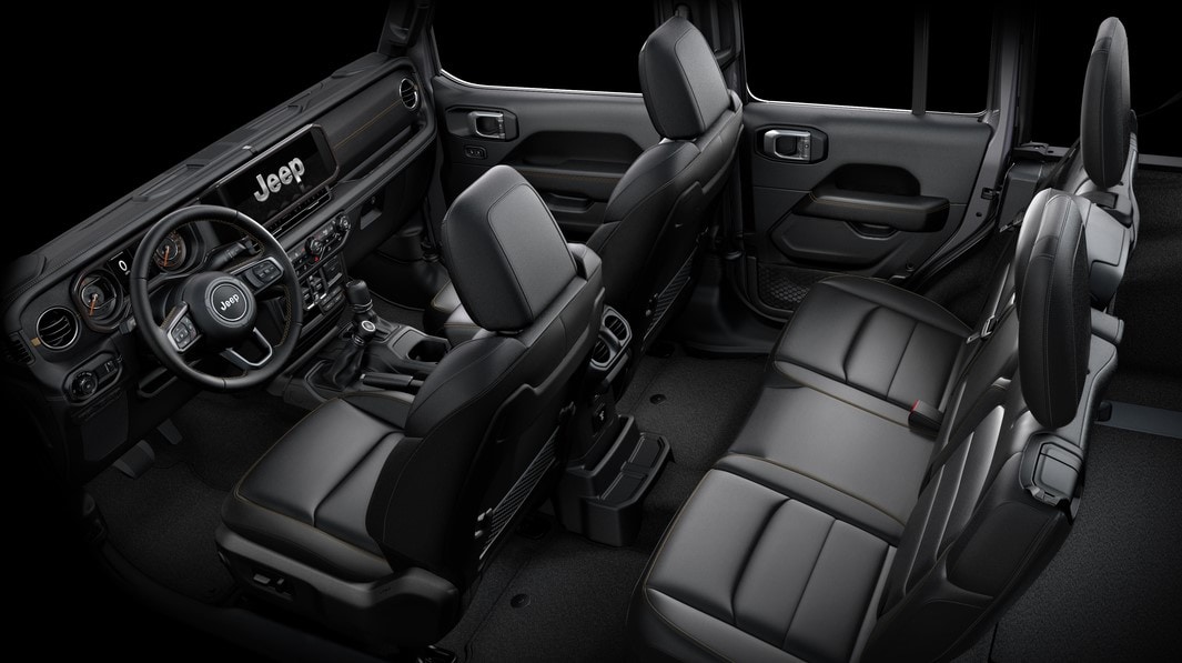 The Wrangler also has a spacious, comfortable interior. Two-door models have four seats, a passenger volume of 104 cubic feet, and a maximum interior cargo volume. Four-door models have five seats, a passenger volume of 104 cubic feet, and a maximum interior cargo volume of 72.4 cubic feet. Available interior features include heated and power-adjustable front seats, a heated and leather-wrapped steering wheel, dual-zone automatic climate control, and an available nine-speed Alpine premium audio system.