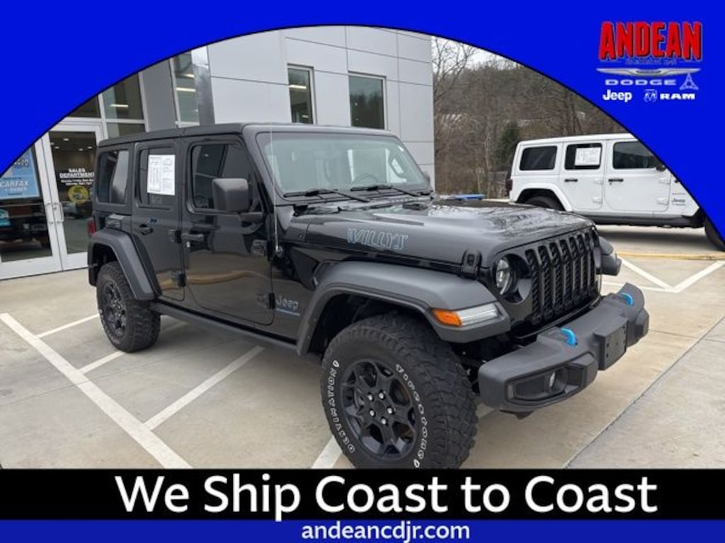 Welcome to Andean CDJR. Our team strives to make your next vehicle purchase hassle free. Copy The Link Below https://www.https://www.andeancdjr.com/financing/application.htm Finance Online, We Can Ship To Your Door! We Have First Time Buyers Program! We Use Over 40 banks and Credit Unions With Lowest Rates Possible For All Types Of Credit! FINANCING FOR ALL TYPES OF CREDIT! BAD CREDIT, NO CREDIT, REPOSSESION NO PROBLEM! SLOW PAYMENTS, BANKRUPTCY, REPOS NO PROBLEM! COLLECTIONS, JUDGEMENTS, DIVORCE NO PROBLEM! TRADE-INS Great! WE BUY CARS Everyday, Even if you don't buy Ours!2023 Jeep Wrangler Willys 4xe 4WD MP3 / I Pod connection, Sirrius XM Radio, 2.0L I4 DOHC, 1-Year SiriusXM Guardian Trial, 3.73 Rear Axle Ratio, 4-Wheel Disc Brakes, 4G LTE Wi-Fi Hot Spot, 4xe 4-Wheel Drive Swing Gate Decal, 5-Year SiriusXM Traffic Service, 5-Year SiriusXM Travel Link Service, 8.4 Radio Group, 8.4 Touchscreen Display, 9 Speakers, ABS brakes, Air Conditioning, Alloy wheels, AM/FM radio: SiriusXM, Apple CarPlay, Apple CarPlay/Android Auto, Auto-Dimming Rear-View Mirror, Automatic temperature control, Black 3-Piece Hard Top, Brake assist, Compass, Convenience Group, Delay-off headlights, Driver door bin, Driver vanity mirror, Dual front impact airbags, Dual front side impact airbags, Electronic Stability Control, Emergency communication system: SiriusXM Guardian, Emergency/Assistance Call, For Details, Visit DriveUconnect.com, Freedom Panel Storage Bag, Front anti-roll bar, Front Bucket Seats, Front Center Armrest w/Storage, Front dual zone A/C, Front fog lights, Front reading lights, Fully automatic headlights, Google Android Auto, GPS Antenna Input, GPS Navigation, HD Radio, Heated door mirrors, Illuminated entry, Integrated Center Stack Radio, Integrated roll-over protection, Integrated Voice Command w/Bluetooth, Low tire pressure warning, Navigation System, Occupant sensing airbag, Off-Road Info Pages, Outside temperature display, Panic alarm, ParkView Rear Back-Up Camera, Passenger door bin, Passenger vanity mirror, Power door mirrors, Power steering, Power windows, Radio data system, Radio: Uconnect 4C Nav w/8.4 Display, Rear anti-roll bar, Rear reading lights, Rear Window Defroster, Rear Window Wiper/Washer, Remote keyless entry, Security system, SiriusXM Traffic Plus, SiriusXM Travel Link, Speed control, Split folding rear seat, Steering wheel mounted audio controls, Tachometer, Telescoping steering wheel, Tilt steering wheel, Traction control, Trip computer, Universal Garage Door Opener, USB Host Flip, Variably intermittent wipers, Voltmeter, Wheels: 17 x 7.5 Black Aluminum.CARFAX One-Owner.Located in Franklin, North Carolina in the heart of Western North Carolina. Andean Chrysler Dodge Jeep Ram is just a short drive from the Knoxville, Greenville, Spartanburg, and Asheville Chrysler dealers. We have a wide array of new and used vehicles. We are certain we can assist you in finding a vehicle to suit your every need and want. Information deemed reliable, but not guaranteed. Interested parties should confirm all data before relying on it to make a purchase decision. All prices and specifications are subject to change without notice. Prices may not include additional fees such as government fees and taxes, title and registration fees, finance charges, and emission testing and compliance charges.